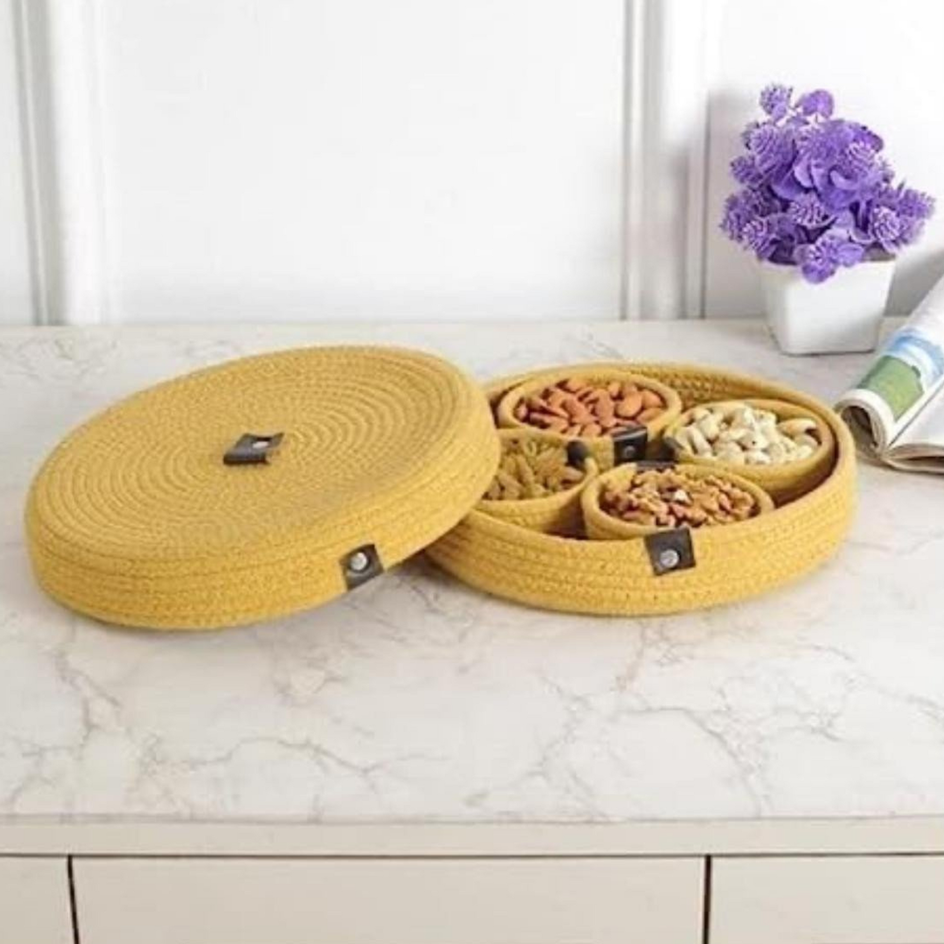 Elevate your dining and gifting experience with our 10-inch Dry Fruit Tray, thoughtfully designed for style and functionality. Crafted from premium eco-friendly jute, this tray features four individual bowls, perfect for serving dry fruits, nuts, candies, or small snacks. Its natural texture adds a rustic yet elegant charm to your table decor, making it ideal for festive occasions, family gatherings, or evening tea time. Lightweight yet durable, the tray is easy to carry and adds a touch of sophistication to every serving. Its sustainable jute material not only looks stunning but also reflects your commitment to eco-conscious living. Whether as a thoughtful gift or a centerpiece for your own home, this tray effortlessly blends practicality with timeless aesthetic appeal. Make every serving an experience with our Jute Dry Fruit Tray – where elegance meets utility.