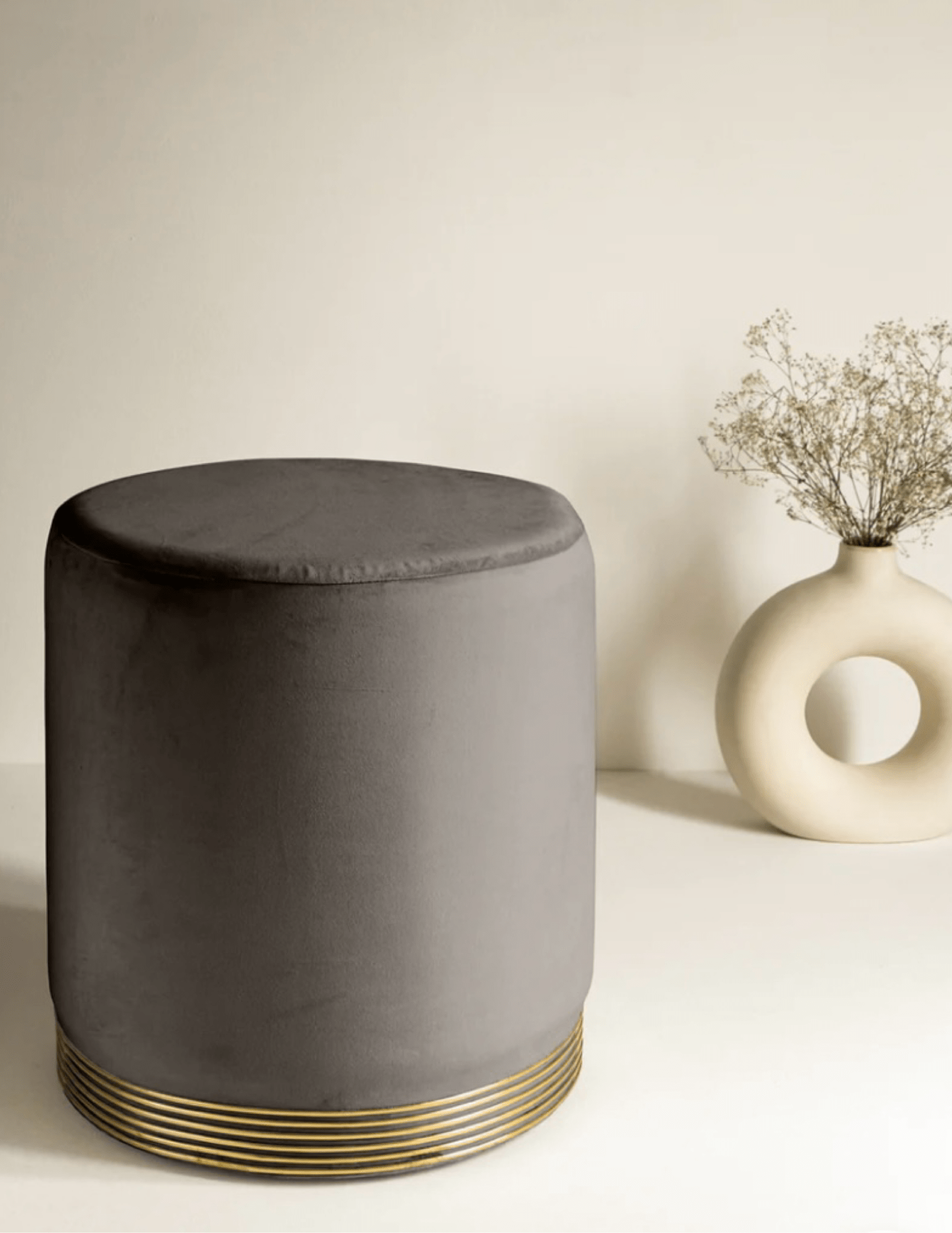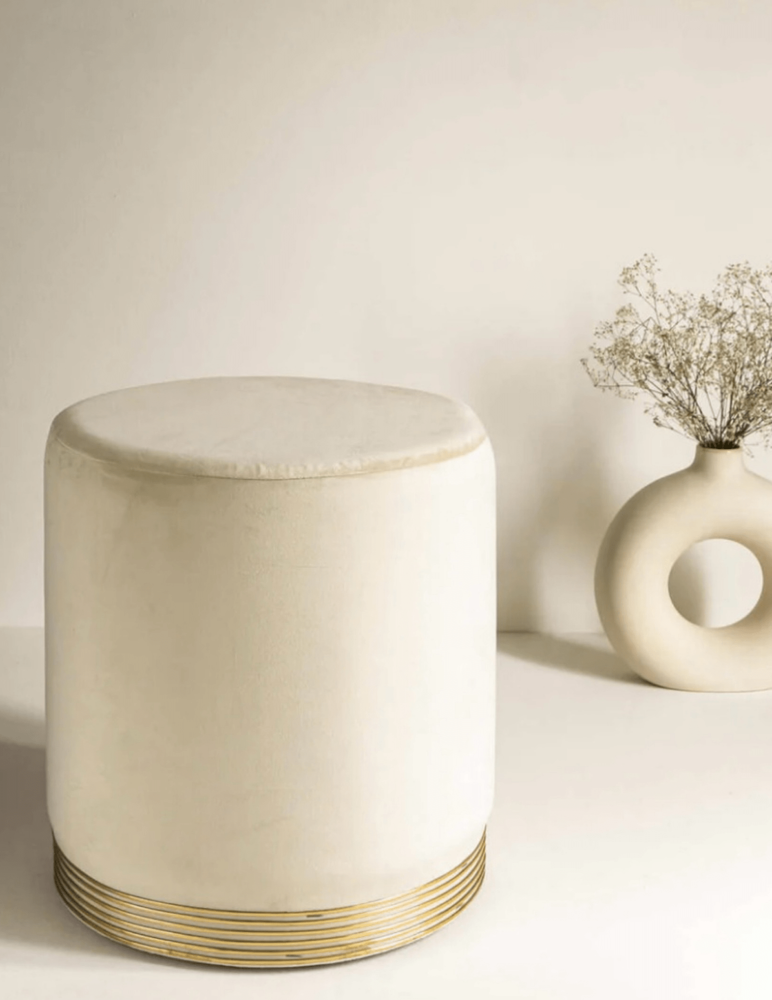 Design: Elegant ottoman stool with golden ring accents